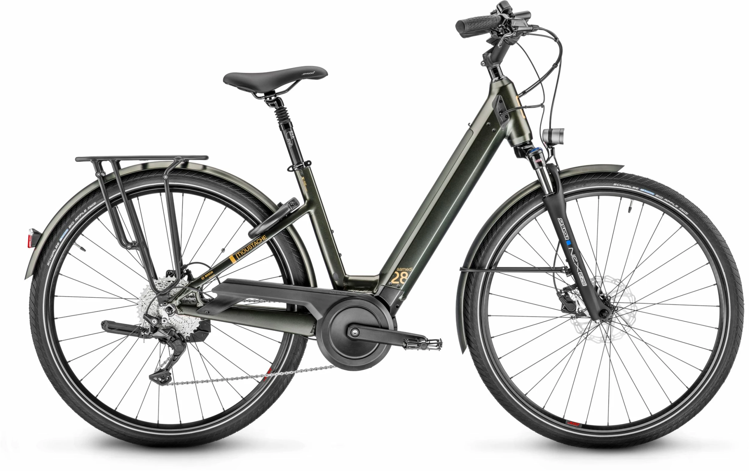 Cadre | Samedi 28 Open, aluminium 6061 T4-T6, tubes hydroformés à épaisseur variable, intégration exclusive pour batterie Bosch PowerTube (verticale), passage de gaines intégré |